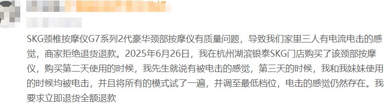 此案例并非孤例。更早之前,就有大量用户在社交媒体和投诉平台反映SKG产品存在“使用后颈部烫伤”、“脉冲刺痛感强烈”等体验不佳甚至存在风险的问题。