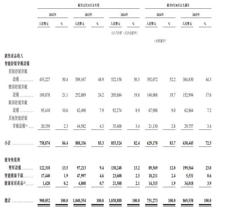 根据公司最新招股书,虽然2025年前九个月公司总营收增长16.22%至8.78亿元,但作为公司基石的核心品类——“智能舒缓穿戴设备”收入仅为6.3亿元,同比微增0.2%,增长几乎停滞。