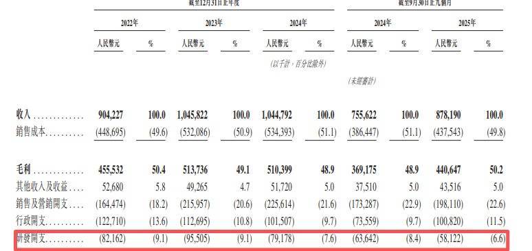 尽管在募集说明书中将“加大研发投入”列为募资首要用途,但公司近年来的实际行动却南辕北辙。其研发投入占营收的比重持续收缩,从2022年的9.1%逐年下滑至2025年9月末的6.6%。在核心产品增长乏力、亟待技术突破的关头,这种削减研发的行为使其科技创新的口号显得有些无力。