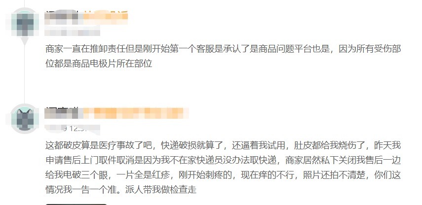 不仅如此,有消费者投诉称,在SKG抖音官方旗舰店购买了产品,试用后出现“肚皮烧伤”、“电破三个眼,一片全是红疹”的严重身体损伤。该消费者明确指出所有受伤部位均与商品电极片位置吻合,并指责商家“推卸责任”,甚至将其定性为“医疗事故”。